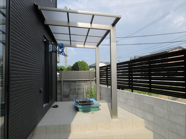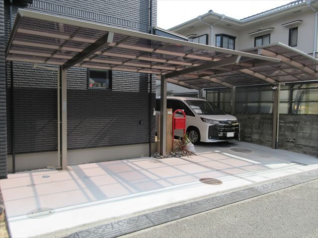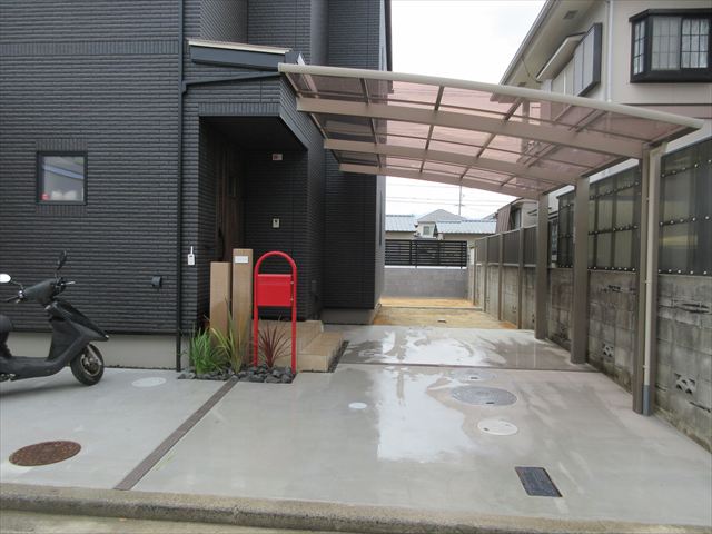 愛媛県松山市のエクステリア 外構リフォームのエクステリアムラハシ 新築外構南梅本T様邸 直接依頼のお客様 黒い外壁に 赤いポストが よくマッチし華やかさが感じられます 実用的に カーポートを取り付けられ 雨の日も苦にならず 車に乗り降りができます T様のご希望でした 一覧を見る