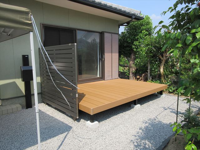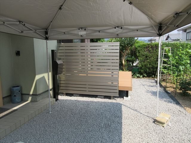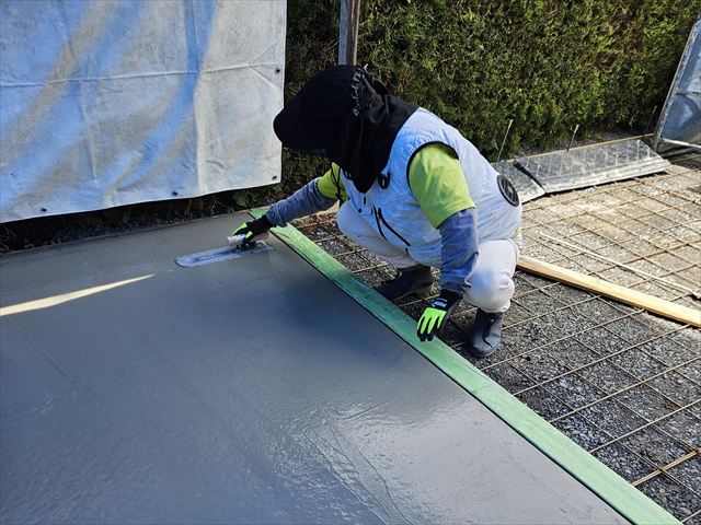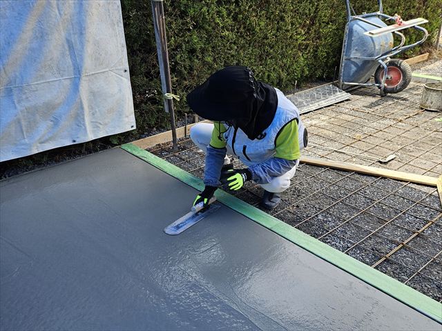愛媛県松山市 エクステリア 外構リフォームのエクステリアムラハシ 小川T様邸 直接工事のお客様 雑草対策 土間コンクリート仕上げ 防草シートジャリ敷 他ウッドデッキ 機能門柱 今日はお施主さまが お休みの日でコンクリと押さえを体験をしているところです 一覧を見る